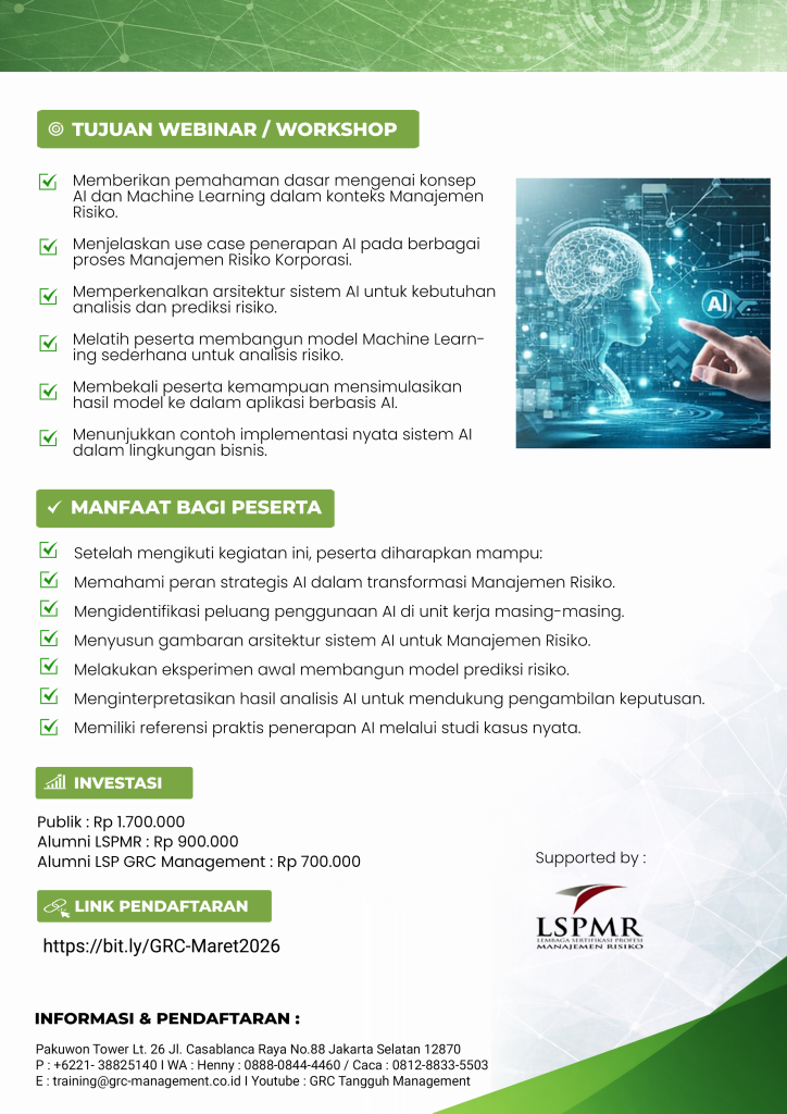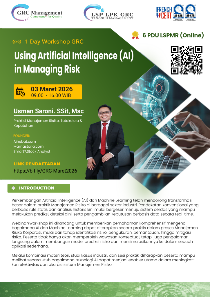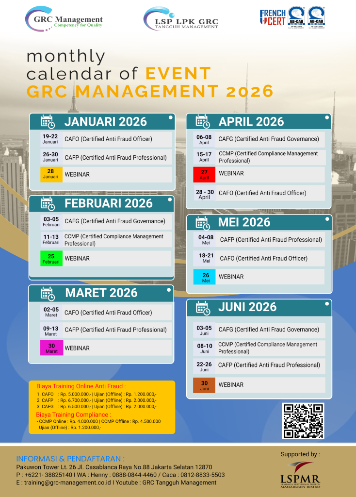 GRC Tangguh Management Menyediakan jasa konsultasi dan menjadi tempat pendidikan dan pelatihan khusus dibidang Manajemen Risiko berbasis ISO 31000, Sertifikasi Anti Fraud.